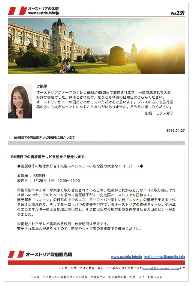 ■BS朝日で放送された『菅原明子の地球大好き未来便スペシャル』〜小さな国の大きなエコに学ぶ〜をオーストリア政府観光局広報に取り上げていただきました。
